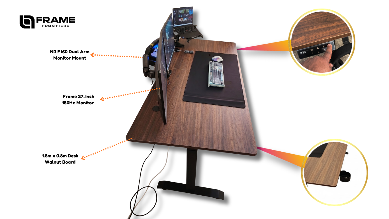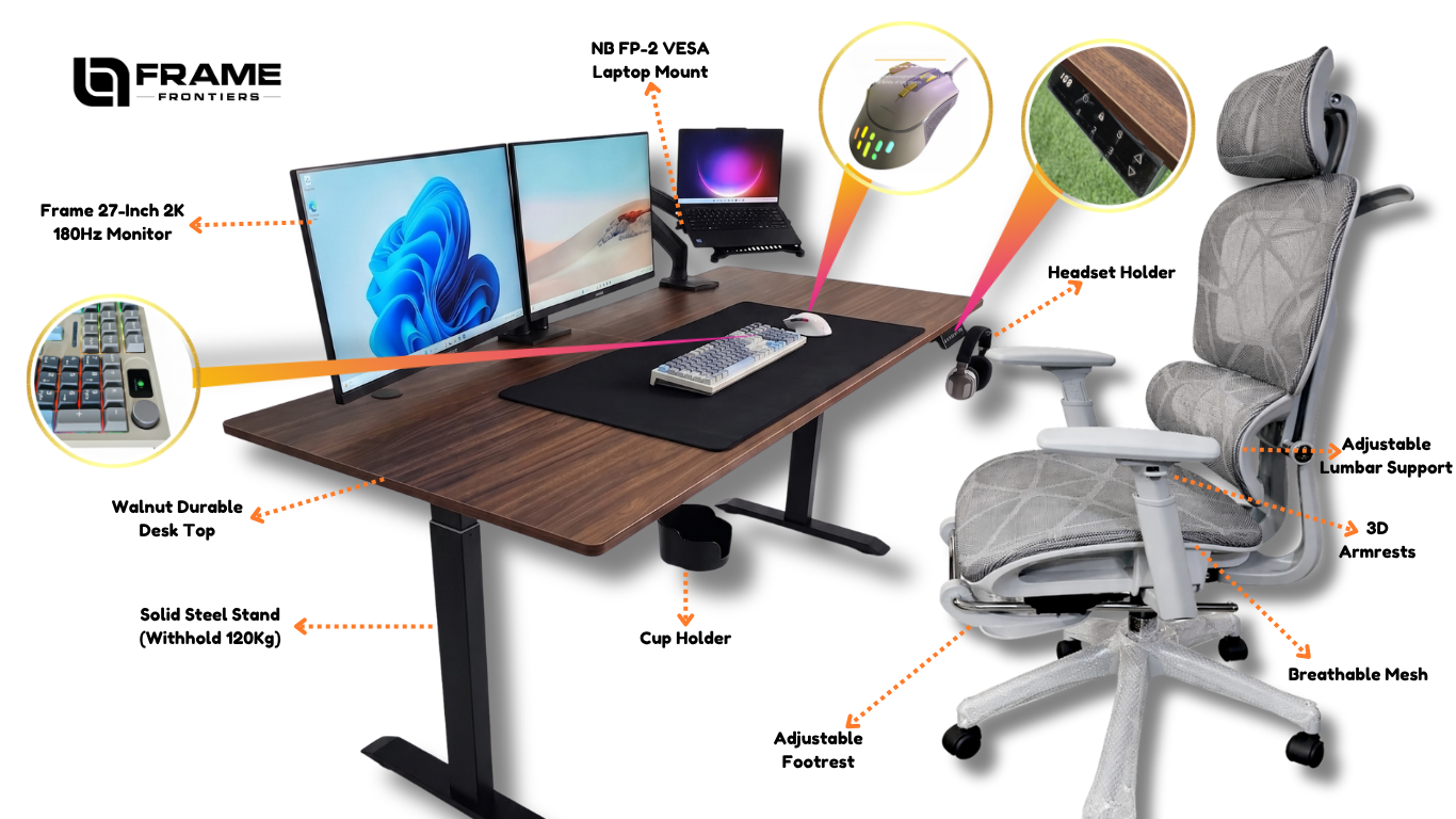 FeaturedElevate your productivity with the Frame Frontiers premium standing desk setup. This modern ergonomic desk setup is designed to boost productivity, comfort, and efficiency in any workspace. Featuring a durable walnut desktop supported by a solid steel frame, the setup combines style with long-lasting performance. The dual-monitor configuration provides an efficient workflow for multitasking, while the NB FP-2 VESA laptop mount adds flexibility for additional screen use. Built for comfort, the workspace includes an ergonomic mesh office chair with adjustable lumbar support, 3D armrests, and a breathable design for extended work sessions. Functional accessories such as a built-in cup holder, headset holder, and under-desk cable management system keep your workspace organized and clutter-free. Perfect for professionals, remote workers, programmers, and content creators, this minimalist desk setup delivers a clean aesthetic while maximizing performance and comfort. Upgrade your home or office with a workspace designed for focus, efficiency, and modern productivity.