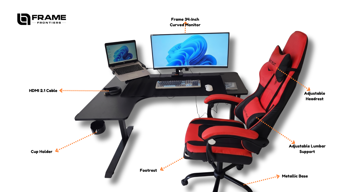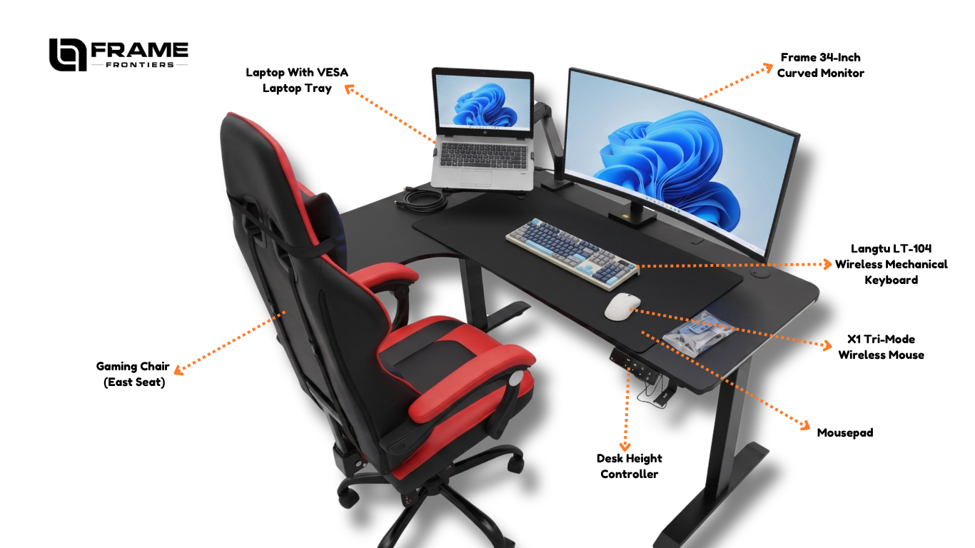 Transform your workspace into a high-performance command center with the Frame Frontiers Ultimate L-Shaped Productivity Suite. Designed for professionals and gamers who refuse to compromise, this setup features a sprawling L-shaped standing desk integrated with a premium Frame 34-inch curved monitor for unparalleled immersion. With ergonomic excellence at its core, the suite includes an adjustable East Seat gaming chair, a VESA-mounted laptop tray for seamless dual-screen workflows, and high-precision peripherals like the Langtu mechanical keyboard and X1 tri-mode wireless mouse. Whether you are tackling complex data or dominating the leaderboard, this curated ecosystem optimizes every inch of your desk for maximum efficiency and comfort.